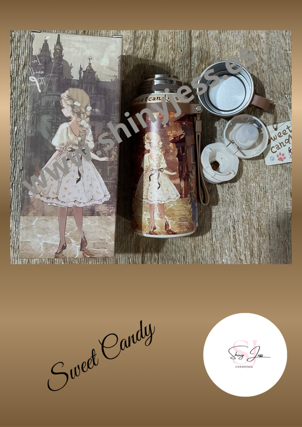 Botella Termo con Diseño Muñeca Sweet Candy, 2 Tapones y Asa de Mano para Mujer.